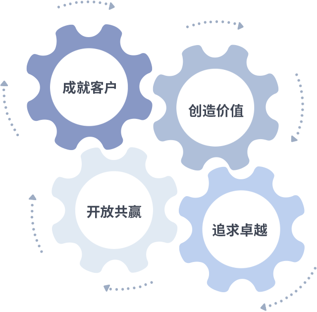 成就客户是一切决策的出发点,创造价值是衡量所有工作的标准,追求卓越是KYKY开元做事做人的态度,开放共赢是KYKY开元的格局也是最终的结果。价值观的齿轮环环相扣,推动着组织里的每个人不断向前。